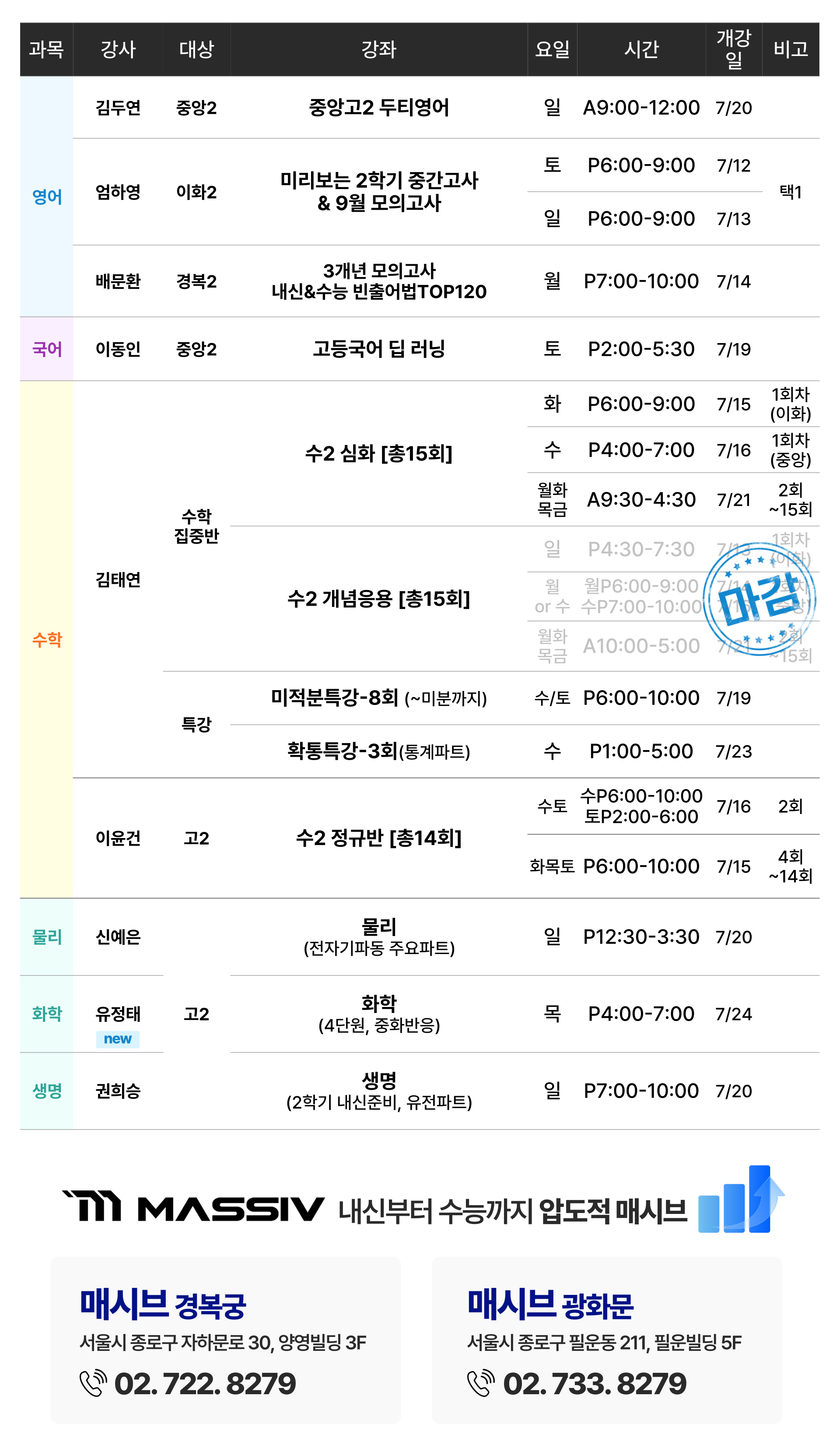 매시브 경복궁∙광화문2025 여름학기 썸머 특강고2, 압도적 라인업!