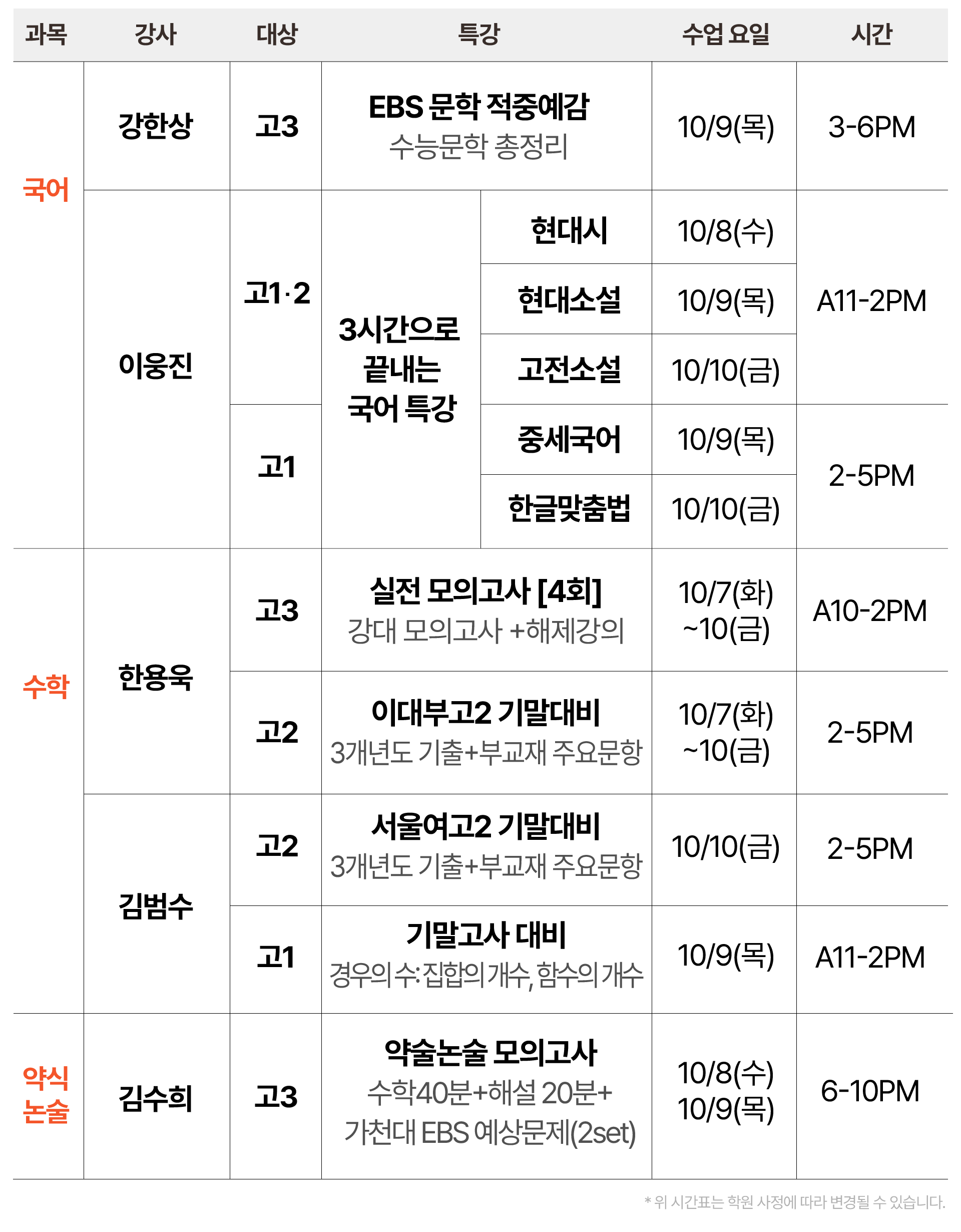 시간표 및 특강 안내